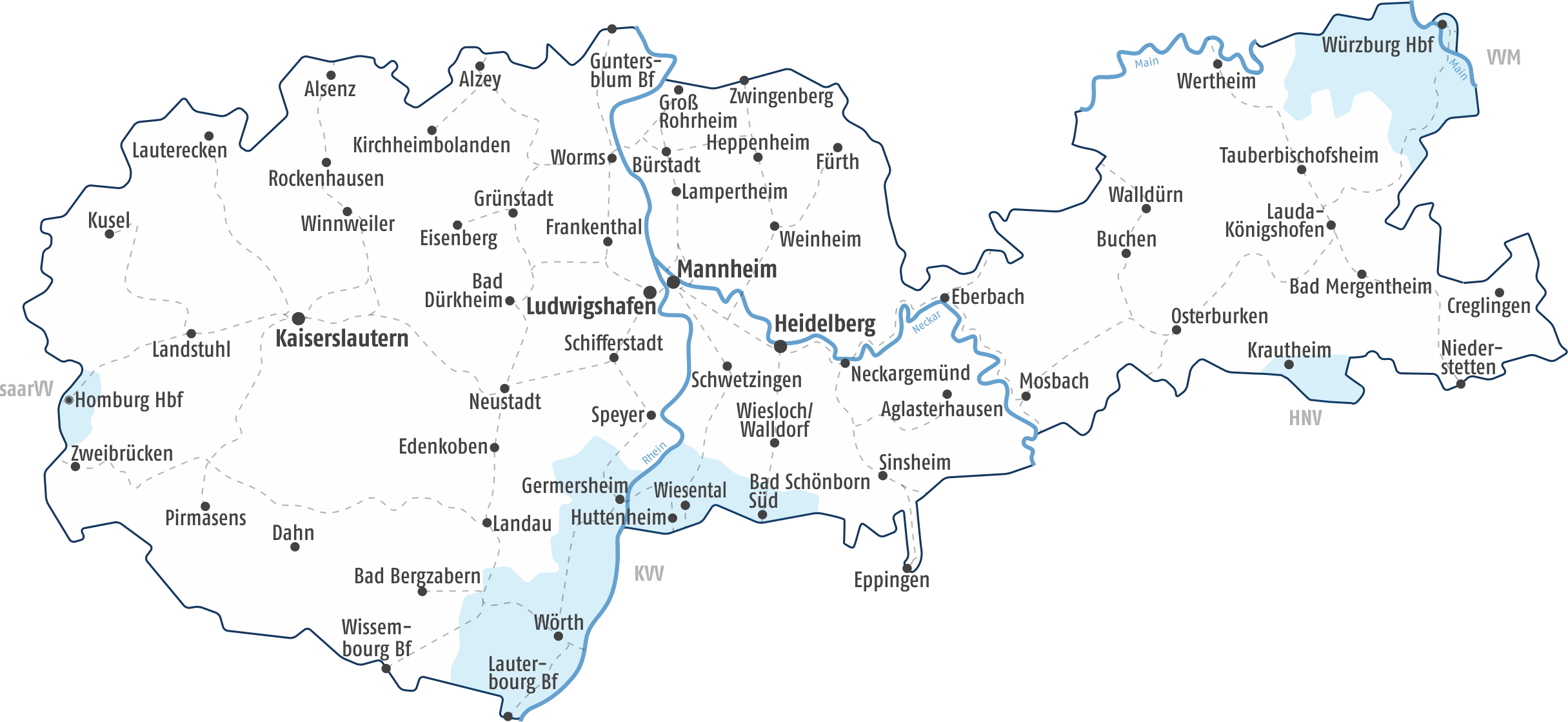 Das Anschluss-Ticket gilt für eine Fahrt und nur in Verbindung mit der VRN-Zeitkarte im gesamten VRN-Verbundgebiet und in den Übergangsbereichen zum KVV und zum HNV - Wabe 218 - in allen Bussen und Bahnen (DB: RE, RB und S-Bahn) jeweils 2. Klasse sowie in den Bereichen zum VVM bis Würzburg Hbf und zum saarVV bis Homburg Hbf. Die Geltungsdauer beträgt maximal 360 Minuten.