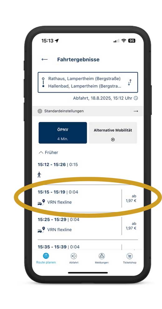 - Zeigt die gesamten Fahrtdetails zur VRNflexline-Fahrt