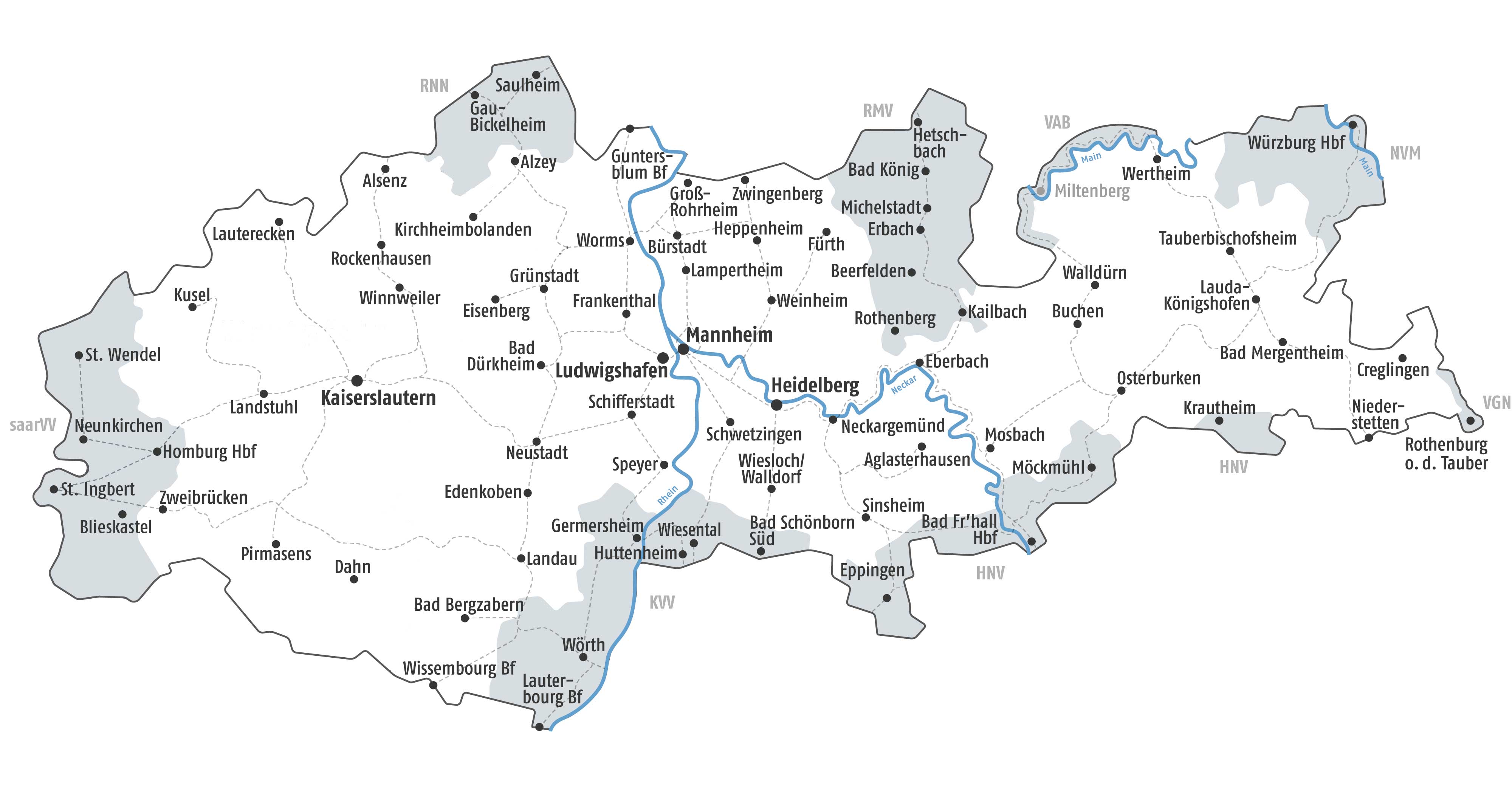 Das VRN-Tarifgebiet reicht von Kusel und Zweibrücken im Westen bis Wertheim und Bad Mergentheim im Osten. Im Norden erstreckt es sich bis Alzey und Bensheim, im Süden bis Landau und Sinsheim. Und das bequem, preiswert und flexibel. Mit aufeinander abgestimmten Fahrplänen und einem einheitlichen Tarifangebot können Sie alle Busse, Straßenbahnen und freigegebenen Züge (DB: RE, RB und S-Bahn jeweils in der 2. Klasse) benutzen. Die Nachbarverbünde sind der Karlsruher Verkehrsverbund (KVV), die Heilbronner-Hohenloher-Haller Nahverkehr GmbH (HNV), der Rhein-Main-Verkehrsverbund (RMV), der Rhein-Nahe Nahverkehrsverbund (RNN), der Verkehrsverbund Mainfranken (VVM), die Verkehrsgemeinschaft am Bayerischen Untermain (VAB) und der Saarländische Verkehrsverbund (saarVV).