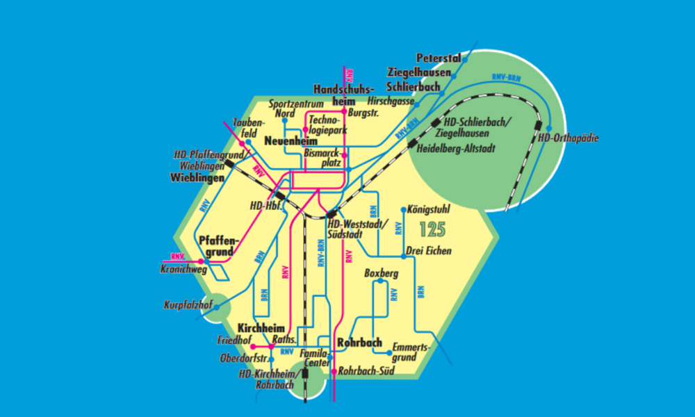 Der Stadttarif Heidelberg umfasst die Wabe 125 inklusive des angrenzenden Bereichs im Übergang zur Wabe 116 (siehe Wabenplanausschnitt) und damit alle Haltestellen, die zur Stadt Heidelberg gehören.