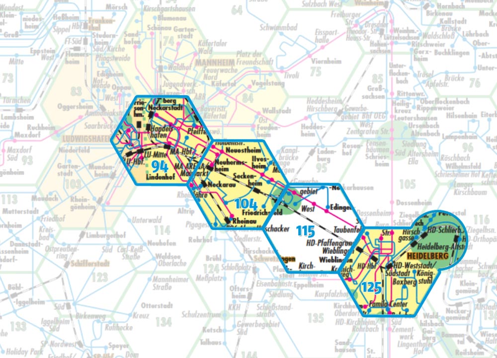 Bei der Fahrt von Mannheim (Zentrum) nach Heidelberg werden die Waben 94, 104, 115 und 125 durchfahren. 4 Waben = Preisstufe 4 bei Einzel-Tickets bzw. Preisstufe Verbundgebiet bei Zeitkarten und allen anderen Tickets. Dabei spielt es keine Rolle, ob Sie mit der Bahn, dem Bus oder der Straßenbahn unterwegs sind. Es zählen nur die durchfahrenen Waben entsprechend des Linienverlaufs. Die gelb markierten Stadttarif-Bereiche bleiben unberücksichtigt.