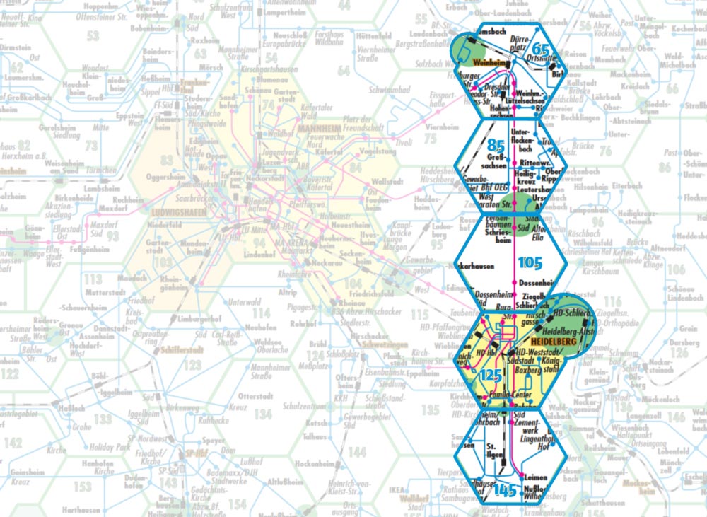 Bei der Fahrt von Leimen nach Weinheim werden die Waben 145, Stadttarif HD, 105, 85 und 65 durchfahren. 5 Waben = Preisstufe 5 bei Einzel-Tickets bzw. Preisstufe Verbundgebiet bei Zeitkarten und allen anderen Tickets. Auch hier spielt es keine Rolle, ob Sie mit der Bahn, dem Bus oder der Straßenbahn unterwegs sind. Es zählen nur die durchfahrenen Waben entsprechend des Linienverlaufs.