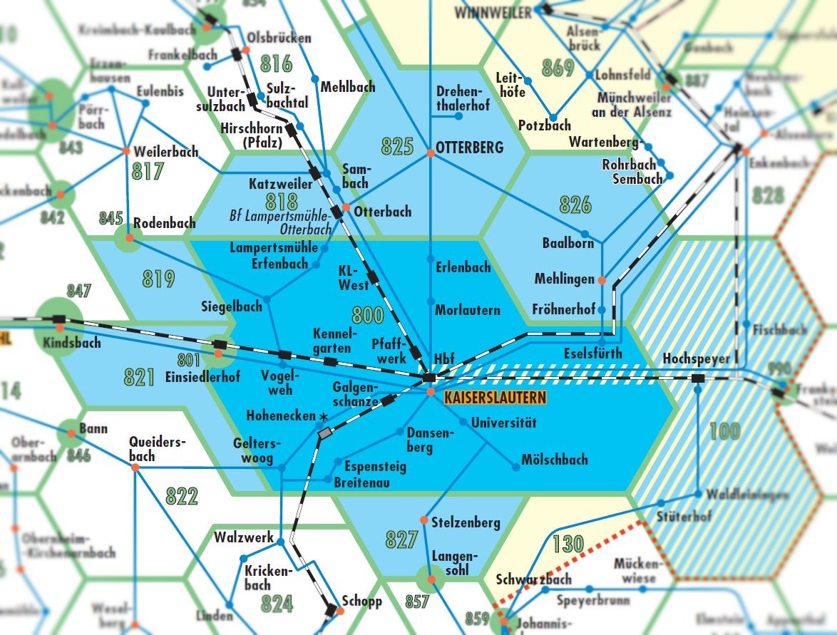 In der Westpfalz gibt es Umlandwaben um die Städte Kaiserslautern, Pirmasens und Zweibrücken. Innerhalb dieser im Wabenplan blau gekennzeichneten Bereiche gilt die Preisstufe 21.