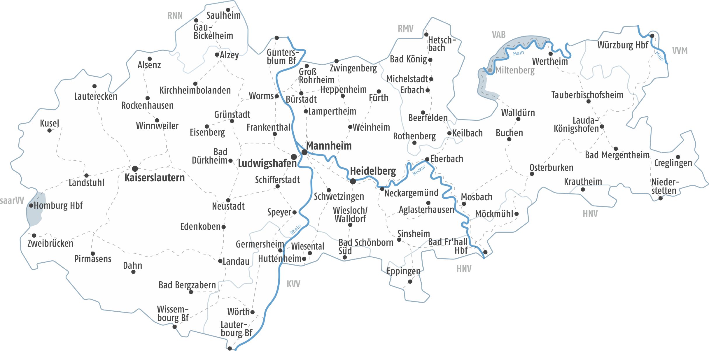 - gilt im gesamten VRN-Verbundgebiet in allen Bussen und Bahnen (DB: RE, RB und S-Bahn) jeweils 2. Klasse, in allen Ruftaxilinien, in der Heidelberger Bergbahn sowie in den Übergangsbereichen zu den benachbarten Verbünden KVV, HNV, RMV, RNN und VVM und zur Durchquerung in den Übergangsbereichen zum saarVV und VAB mit Umstieg in Homburg Hbf bzw. Miltenberg