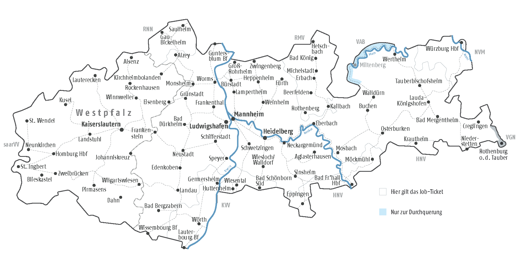 - gilt im gesamten VRN-Verbundgebiet in allen Bussen und Bahnen (DB: RE, RB und S-Bahn) jeweils 2. Klasse, in allen Ruftaxilinien, in der Heidelberger Bergbahn sowie in den Übergangsbereichen zu den benachbarten Verbünden KVV, HNV, RMV, RNN, saarVV und NVM und zur Durchquerung im Übergangsbereich zum VAB mit Umstieg in Miltenberg.