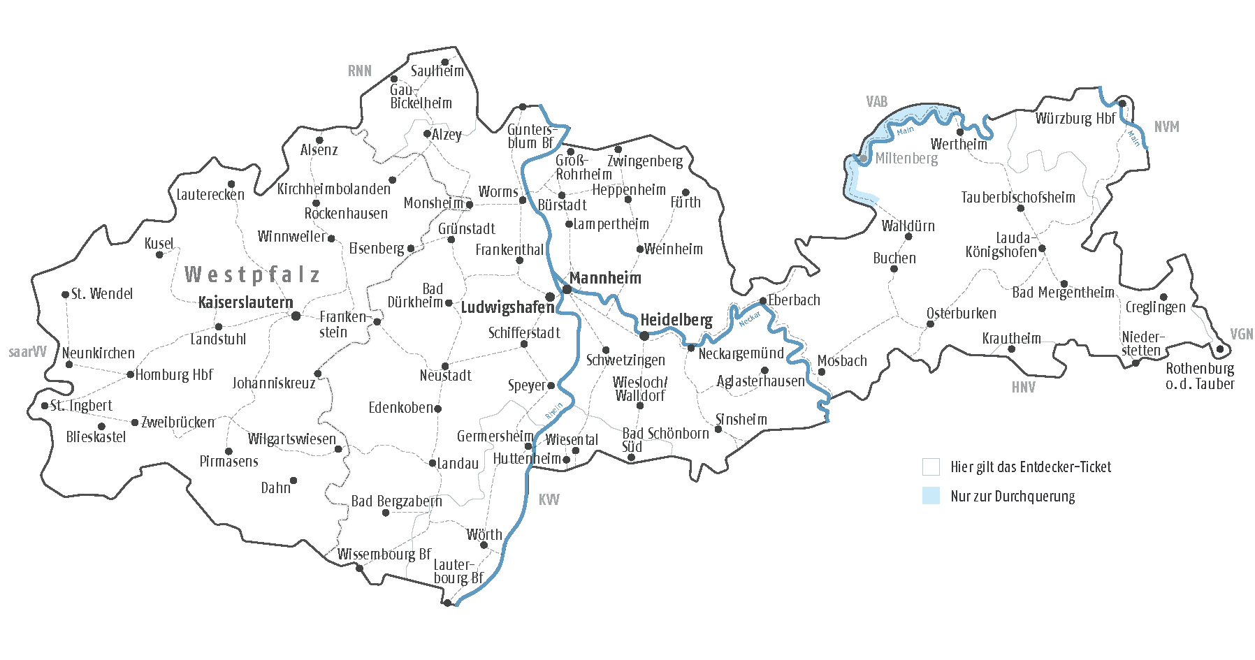 - gilt im gesamten VRN-Verbundgebiet in allen Bussen und Bahnen (DB: RE, RB und S-Bahn) jeweils 2. Klasse, in allen Ruftaxilinien, in den Übergangsbereichen zu den benachbarten Verbünden KVV und VVM sowie zur Durchquerung in den Übergangsbereichen zum saarVV und VAB mit Umstieg in Homburg Hbf bzw. Miltenberg