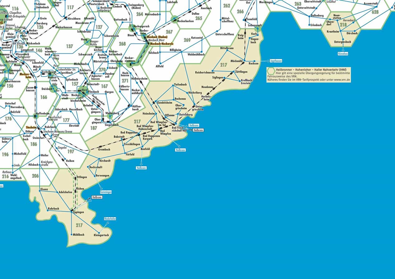 Die im VRN-Wabenplan eingezeichneten Waben 217 und 218 gehören zum Übergangsgebiet des Heilbronner-Hohenloher-Haller Nahverkehr GmbH (HNV).