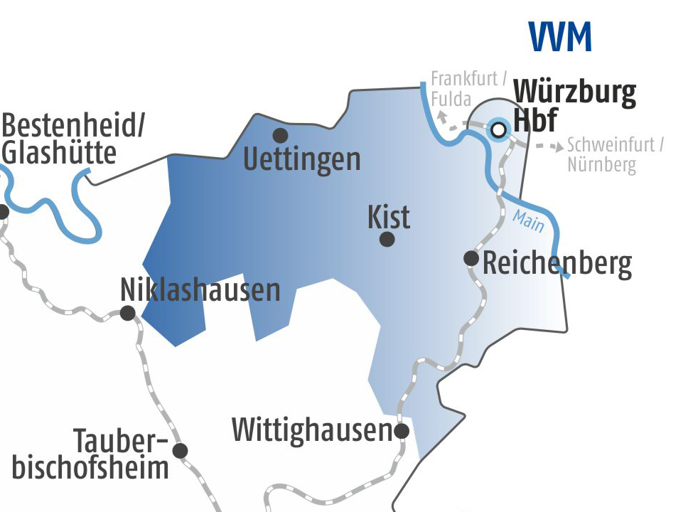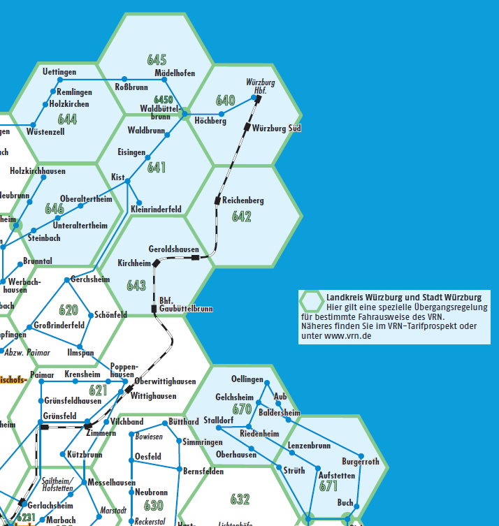 Der VRN-Tarif gilt im ein- und ausbrechenden Verkehr zwischen der Stadt Würzburg (nur Hbf) bzw. dem Landkreis Würzburg und dem VRN-Gebiet