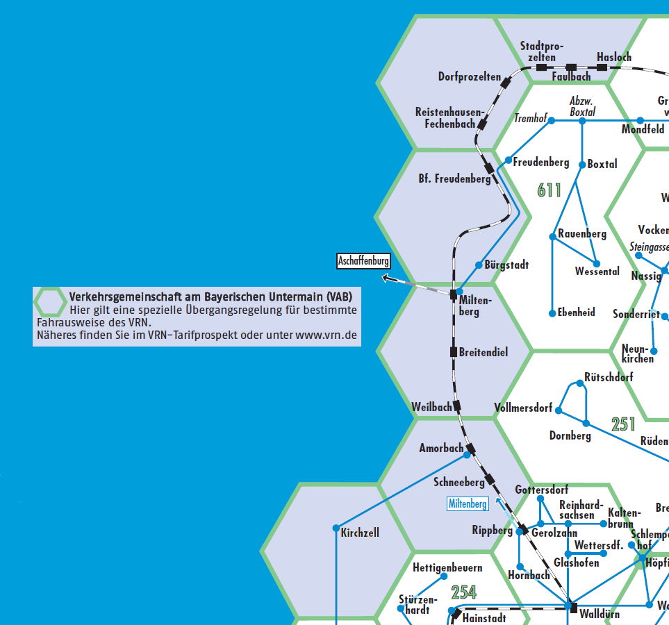 Hierzu wird die im Wabenplan des VRN grau markierte und im Gebiet der Verkehrsgemeinschaft am Bayerischen Untermain (VAB) liegende Wabe „Miltenberg“ bei der Preisermittlung berücksichtigt.