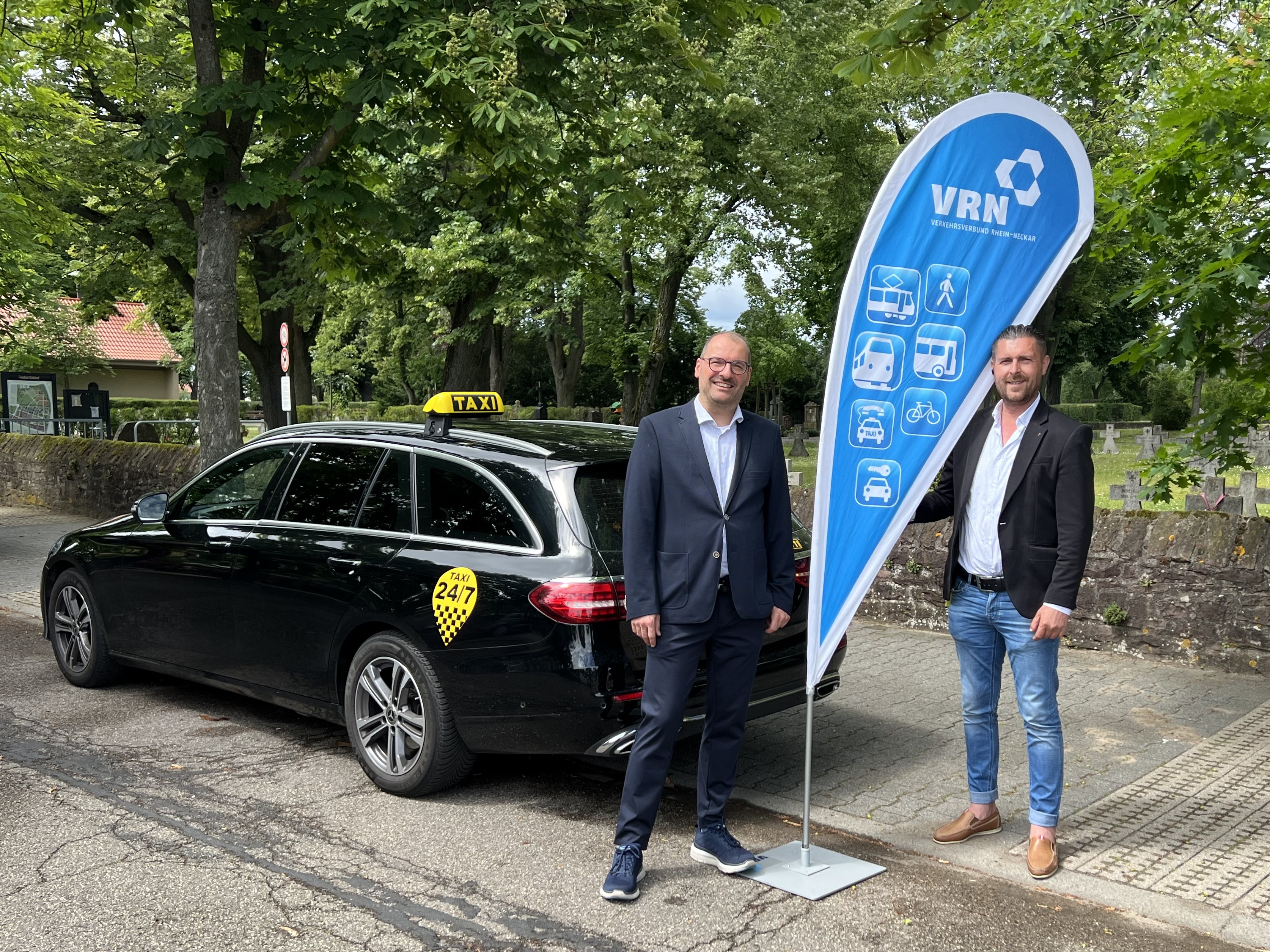 V.l.: VRN-Geschäftsführer Dr. Michael Winnes mit Ismail Imer, Mitarbeiter des Taxiunternehmens Fellhauer, am Friedhof in Walldorf. Auch hier kann das VRNruftaxi ab 1. Juni noch einfacher und bequemer digital bestellt werden.