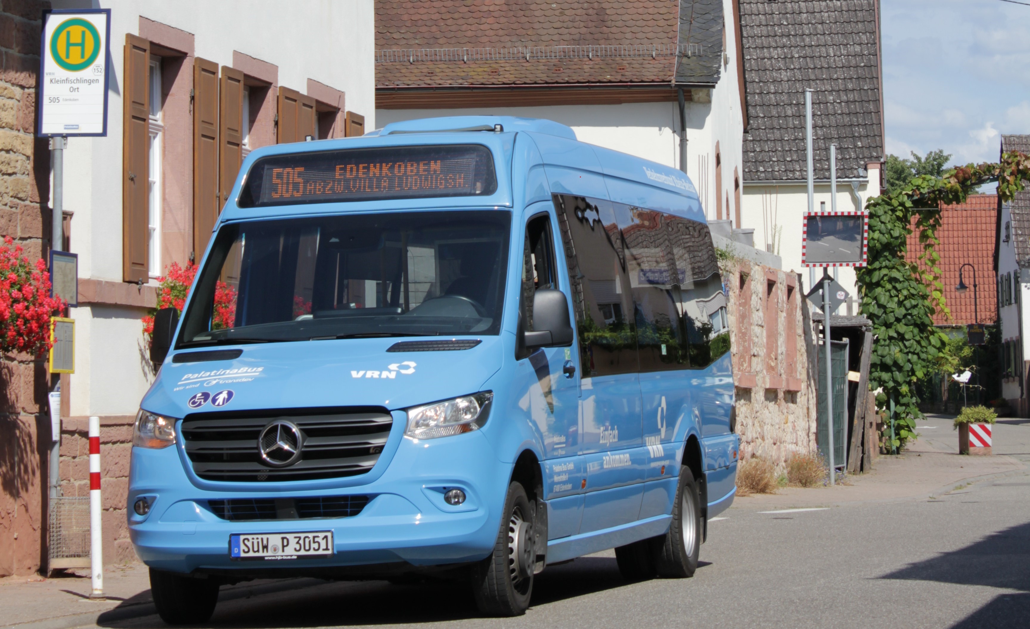 Dieser blaue Kleinbus wird auf der VRNflexline unterwegs sein, Kennzeichen SÜW P 3051. Hier steht er schon mal in Kleinfischlingen. Foto: Palatina Bus