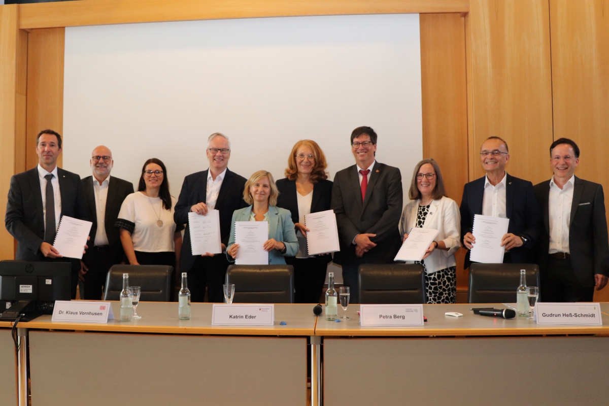 Bildunterschrift:v.l.: Philipp Langefeld (Leiter Infrastrukturprojekte Südwest DB InfraGO AG); Michael Forster (künftiger Oberbürgermeister Stadt Homburg); Cristina Reisenauer (Prokuristin u. Geschäftsbereichsleiterin Fahrgast & Finanzierung VRN GmbH); Dr. Klaus Vornhusen (Konzernbevollmächtigter Deutsche Bahn AG für die Länder Rheinland-Pfalz und Saarland); Ministerin Katrin Eder (Ministerium für Klimaschutz, Umwelt, Energie und Mobilität Rheinland-Pfalz); Ministerin Petra Berg (Ministerium für Umwelt, Klima, Mobilität, Agrar und Verbraucherschutz Saarland); Dr. Marold Wosnitza (Oberbürgermeister Stadt Zweibrücken); Gudrun Heß-Schmidt (Stellvertretende Verbandsvorsitzende Zweckverband Verkehrsverbund Rhein-Neckar); Dr. Fritz Brechtel (Verbandsvorsitzender Zweckverband Öffentlicher Personennahverkehr Rheinland-Pfalz-Süd), Michael Heilmann (Verbandsdirektor Zweckverband Öffentlicher Personennahverkehr Rheinland-Pfalz-Süd)