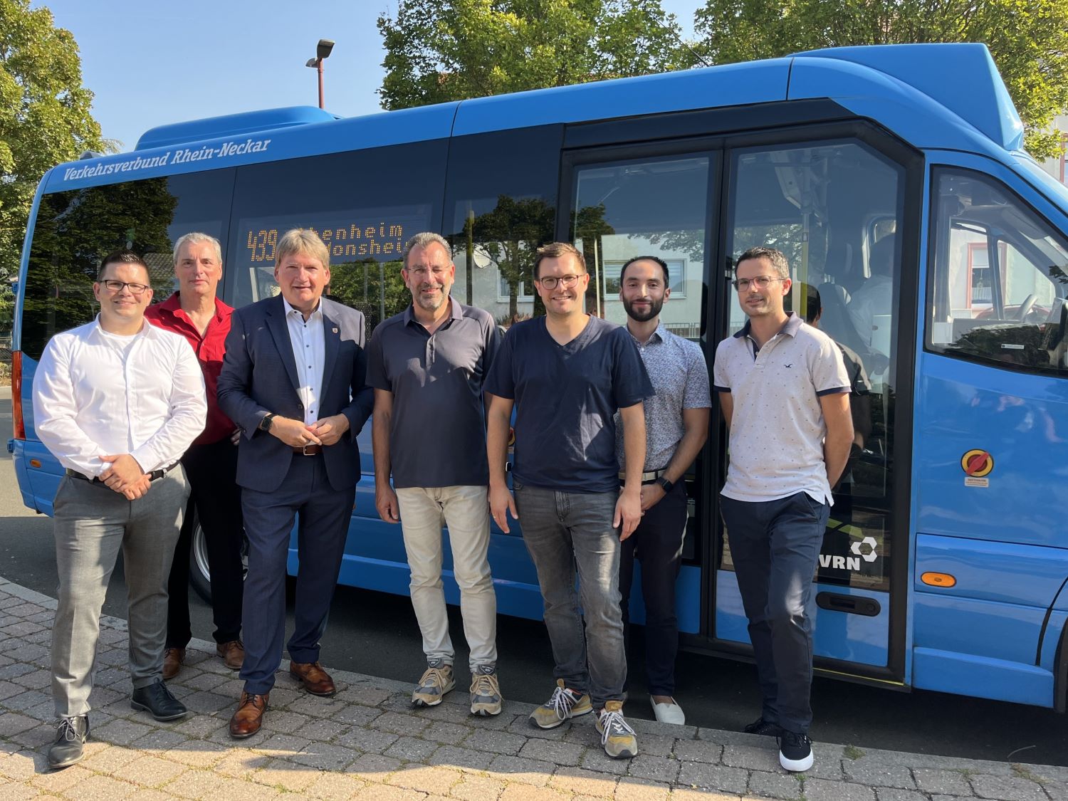V.l.: Marc Hein (Geschäftsführer Behles Bus GmbH), Stephan Hammer (Ortsbürgermeister Mörstadt), Heiko Sippel (Landrat Landkreis Alzey-Worms), Ralph Bothe (Bürgermeister Verbandsgemeinde Monsheim), Kevin Zakostelny (Ortsbürgermeister Monsheim), Dennis Ulas (Verkehrsplaner VRN GmbH), Boris Hetzel (Fachbereichsleiter Ordnung, Verkehr, Bürgerdienste, Verbandsgemeindeverwaltung Monsheim). Foto: VRN GmbH