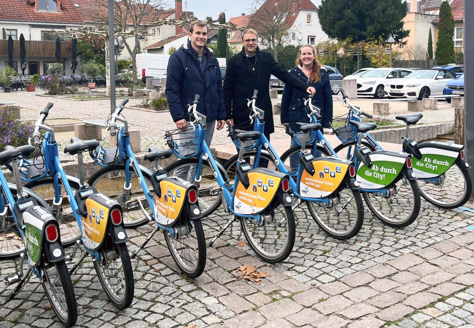V.l.: Lukas Raudonat (Ansprechpartner für VRNnextbike, VRN GmbH), Bürgermeister Florian König, Lisa Schoofs (Referentin des Bürgermeisters, Gemeinde Edingen-Neckarhausen) – Foto: VRN GmbH